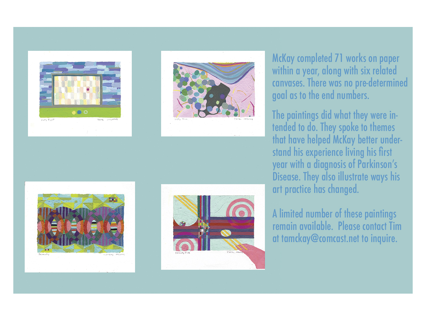 These paintings were featured in the show One to Somewhere at Pirate Contemporary Art. The show centered on McKay’s experience in the first year after a diagnosis of Parkinson’s Disease. The show ran from November 29 to December 15 2024.